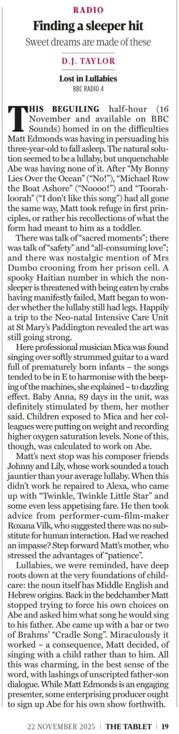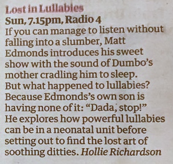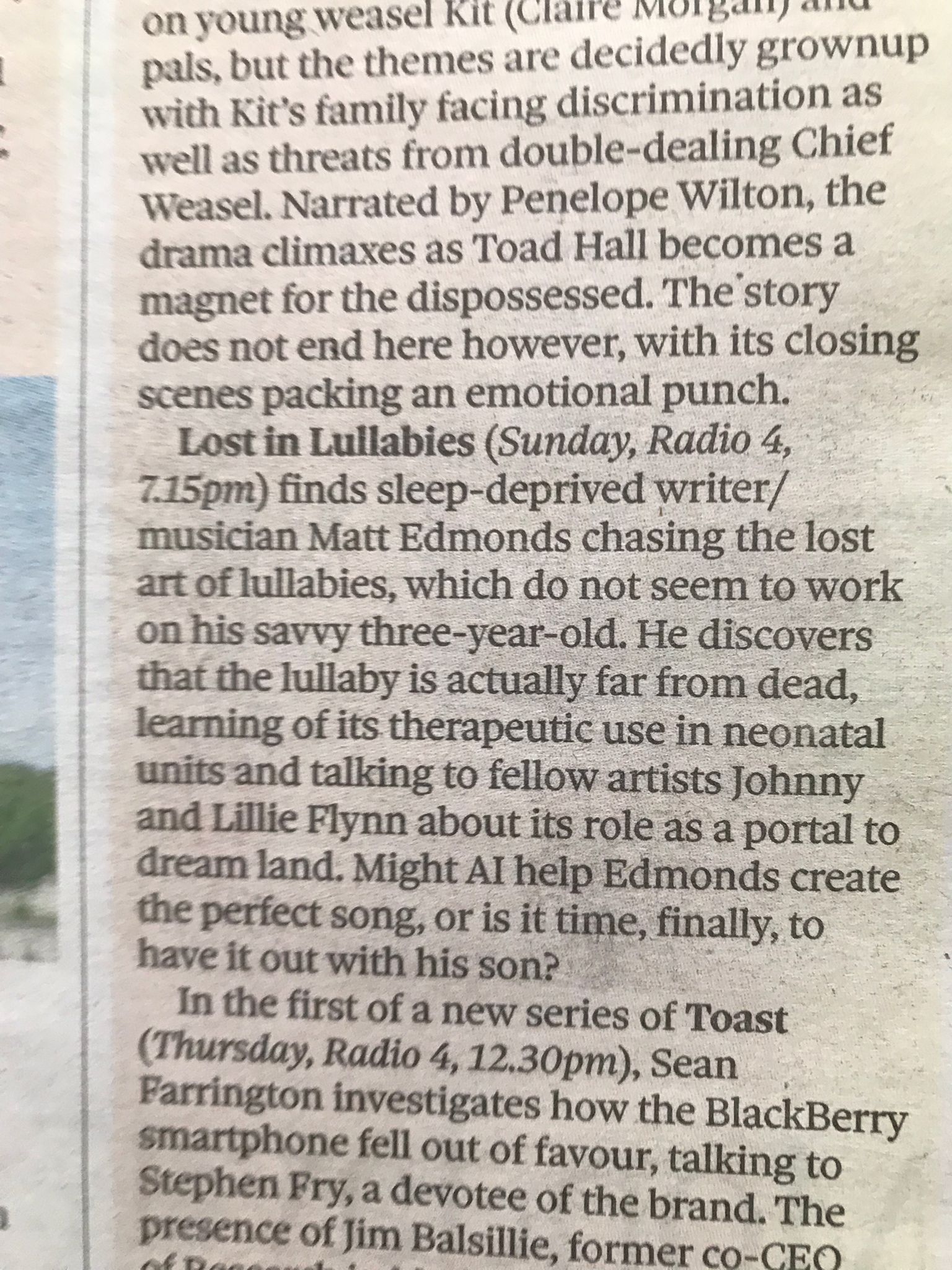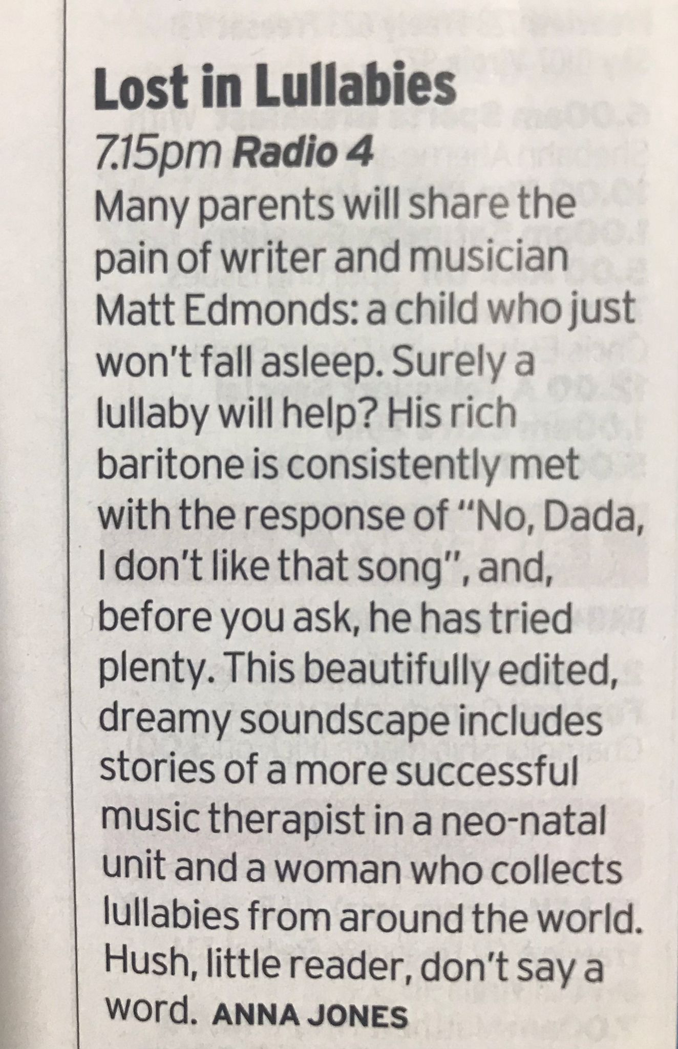 Lost in Lullabies was featured on BBC Radio 4’s prestigious Pick of the Week! A listener even wrote in to say that Matt Edmonds and his son deserved an “audio Oscar” for their performances – and it’s hard to disagree. Presenter Jon Kay also noted that, on the morning Lost in Lullabies was broadcast, Radio 4’s flagship programme Broadcasting House ended with a piano rendition of Brahms’ Cradle Song, played by none other than BBC Moscow correspondent Steve Rosenberg.